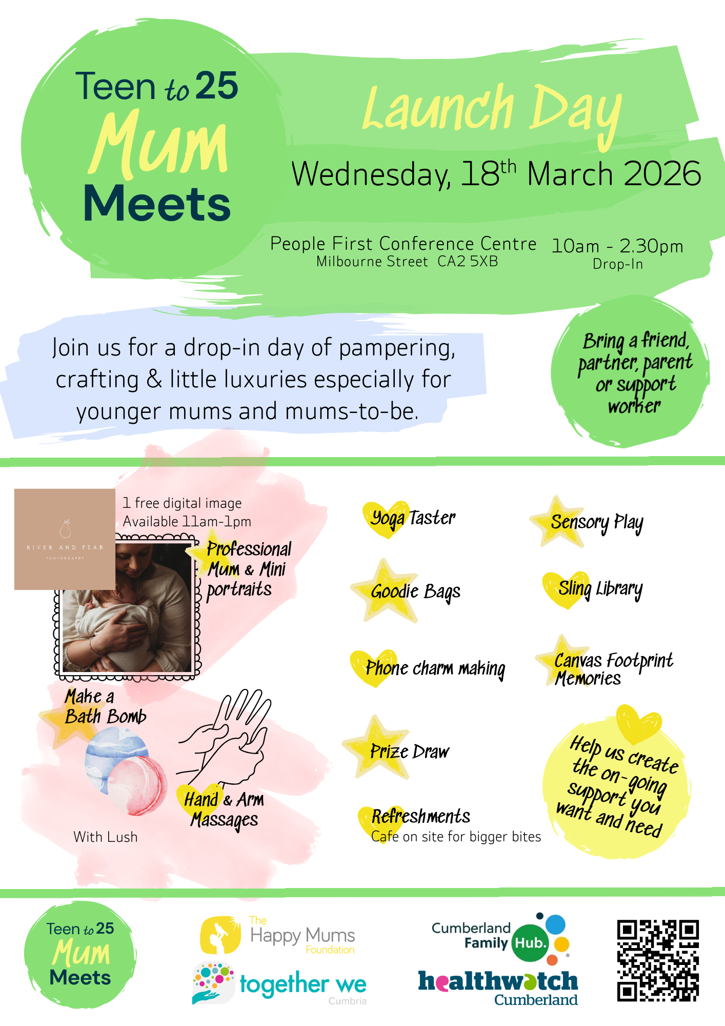 What: informal, drop‑in, baby‑friendly. We’ll co‑design the activities—anything from craft and chat, to practical workshops, to peer support. At a minimum, you’ll find friendly faces and other younger mums to connect with.