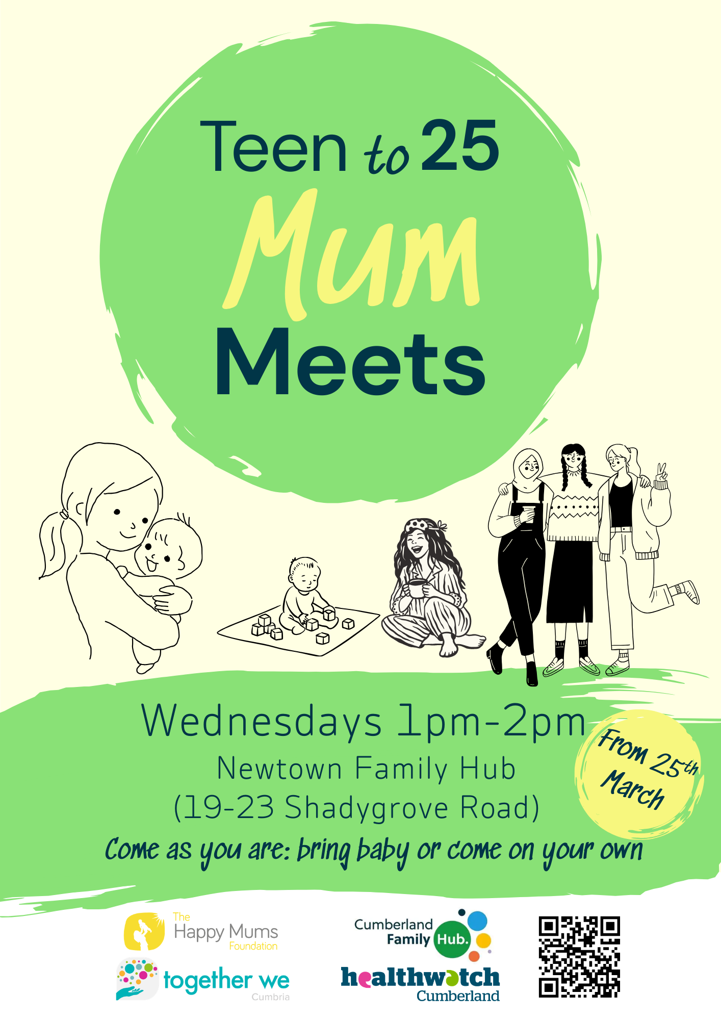 A friendly, low‑pressure space for mums from their teens up to 25.